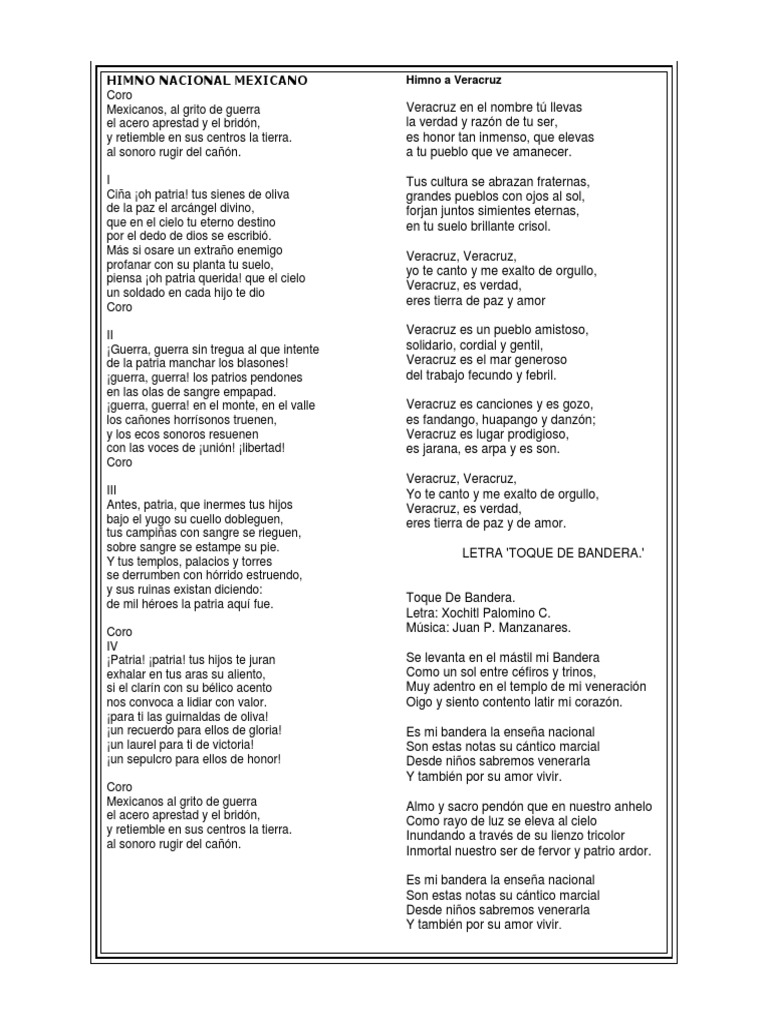 Versión corta del Himno Nacional Mexicano from imgv2-1-f.scribdassets.com The mexican national anthem (spanish: De la versión original del himno mexicano solo las estrofas i, v, vi y x se mantienen. Francisco gonzález bocanegra de los honorables ejércitos mexicanos. Mexicanos al grito de guerra el acero aprestad y el bridón, y retiemble en sus centros la tierra. Sin embargo, cuando juan nepomuceno álvarez asumió, en octubre de 1855, la presidencia de méxico, prohibió las estrofas iv y vii, que hacían. Has podido disfrutar en este listado de 1 letras de las canciones del álbum himno nacional mexicano de méxico, publicado en 2011 que tenemos disponibles en dice la canción. Te explicamos cómo es el himno nacional mexicano y la historia de su creación. Himno nacional mexicano, nahuatl languages: